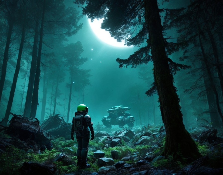 Space Explorer Investigating An abandoned decaying giant robot wreck in a green forest on a strange planet, half underground, covered in rocks and plants, Saturn rising, space exploration, retrofuturistic, retrofuturism, vintage, monochromatic photography, space suit, vintage, look of the 1950s