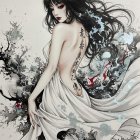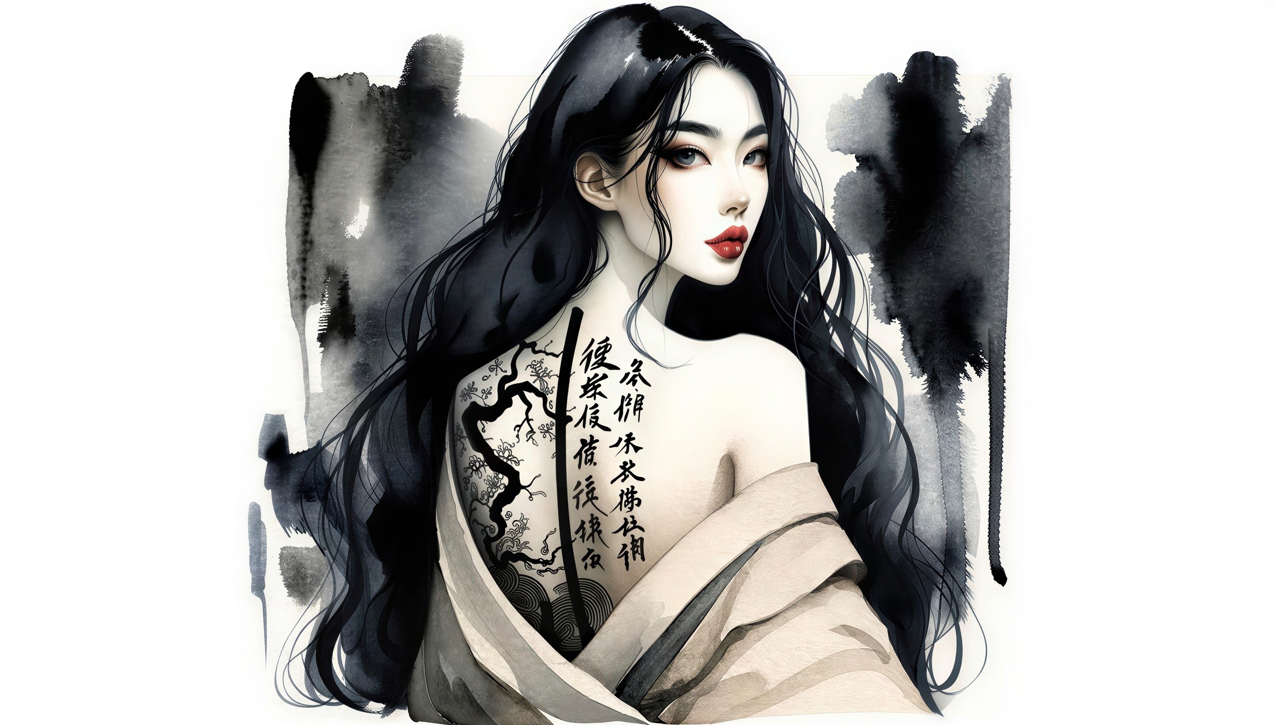 An anime-style, detailed illustration of an Asian woman looking back at the viewer, with long, wavy black hair flowing down her back. She has a tattoo of a black sakura branch and Japanese lettering on her back. She is wearing a cream-colored top, and her lips are painted red.