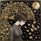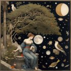 A serene woman in a flowing gown sits in an ornate archway, gazing at a butterfly. Soft moonlight illuminates a lush garden with blooming flowers and distant architecture. A dreamy, tranquil scene.