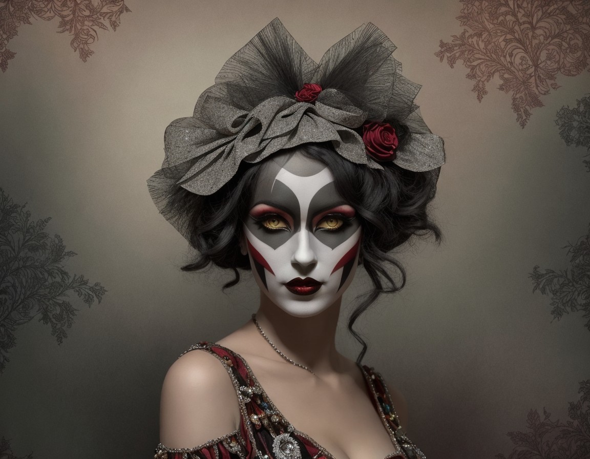 A person with artistic makeup resembling a mime, featuring orange accents, poses against a backdrop with gothic elements and orange flowers.