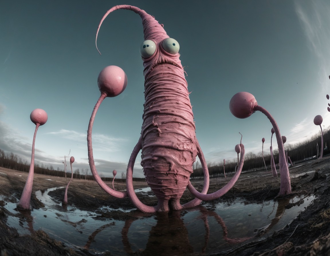 Prompt: A paraphrase on a Louis Waine theme of Super Unique Eccentric Assemblage Gritty-Dirty pastel dystopian alternate hyperbolic universe timelines, that invoke a concept of reimagined schwabach font shaped creature fusion of Ickis, Krumm, and Oblina as envisioned by Dr. Seuss and Luis Royo - Fisheye lens perspective, as de-embodiment of the Theatrical Surrealism is a style of composition and figuration created by Don Bergland. Mixed with art style of Hitoshi Iwaaki and bit style of deconfiguration in the negative space of the generative subconscious and bit style of nobody's artificial intelligence, uncanny, surreal, liminal space