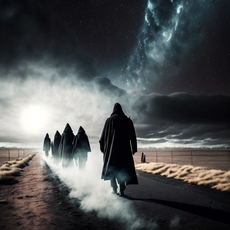 Prompt: "They walked as it were in a black vapour wrought of veritable darkness itself that, as it was breathed, brought blindness not only to the eyes but to the mind, so that even the memory of colours and of forms and of any light faded out of thought. Night always had been, and always would be, and night was all."