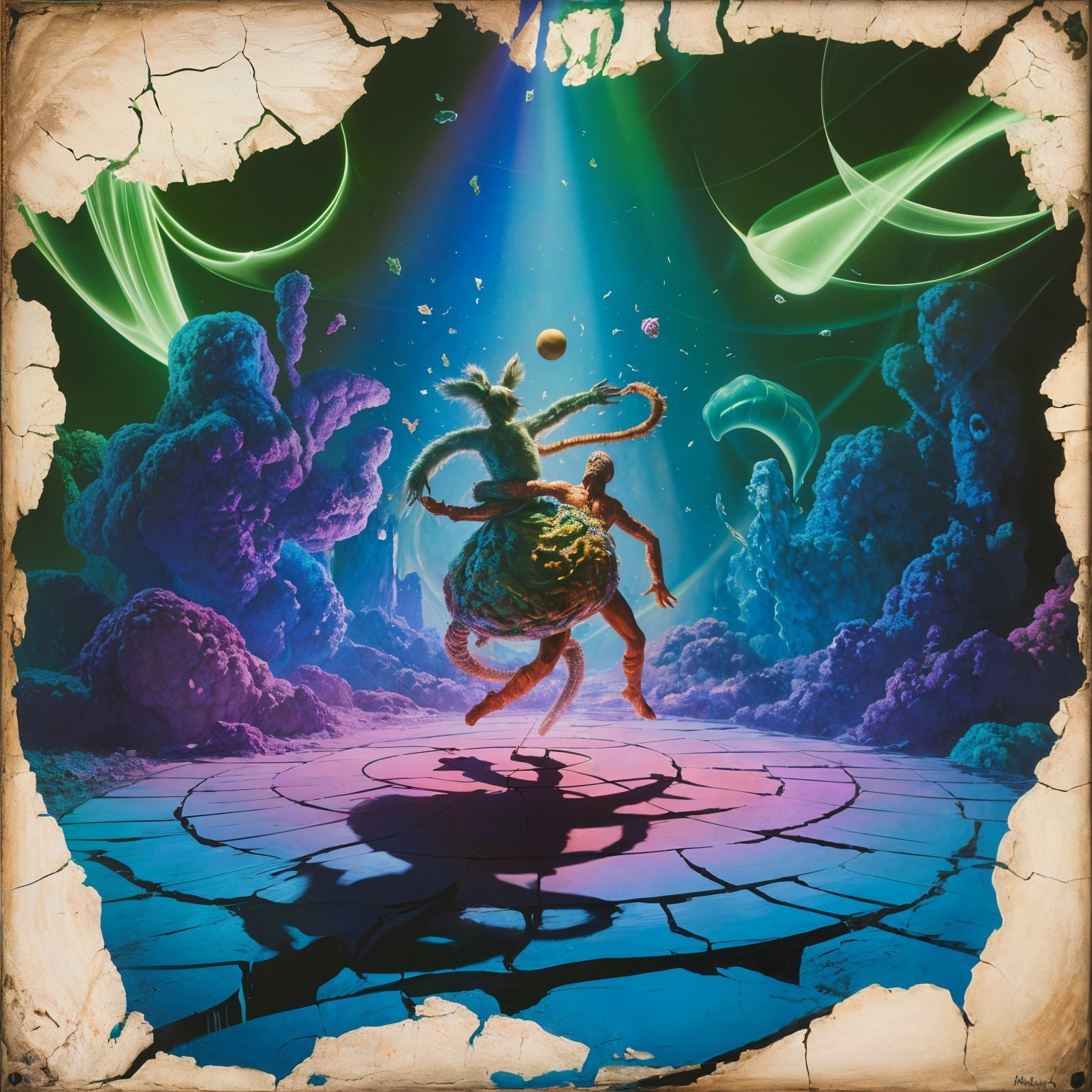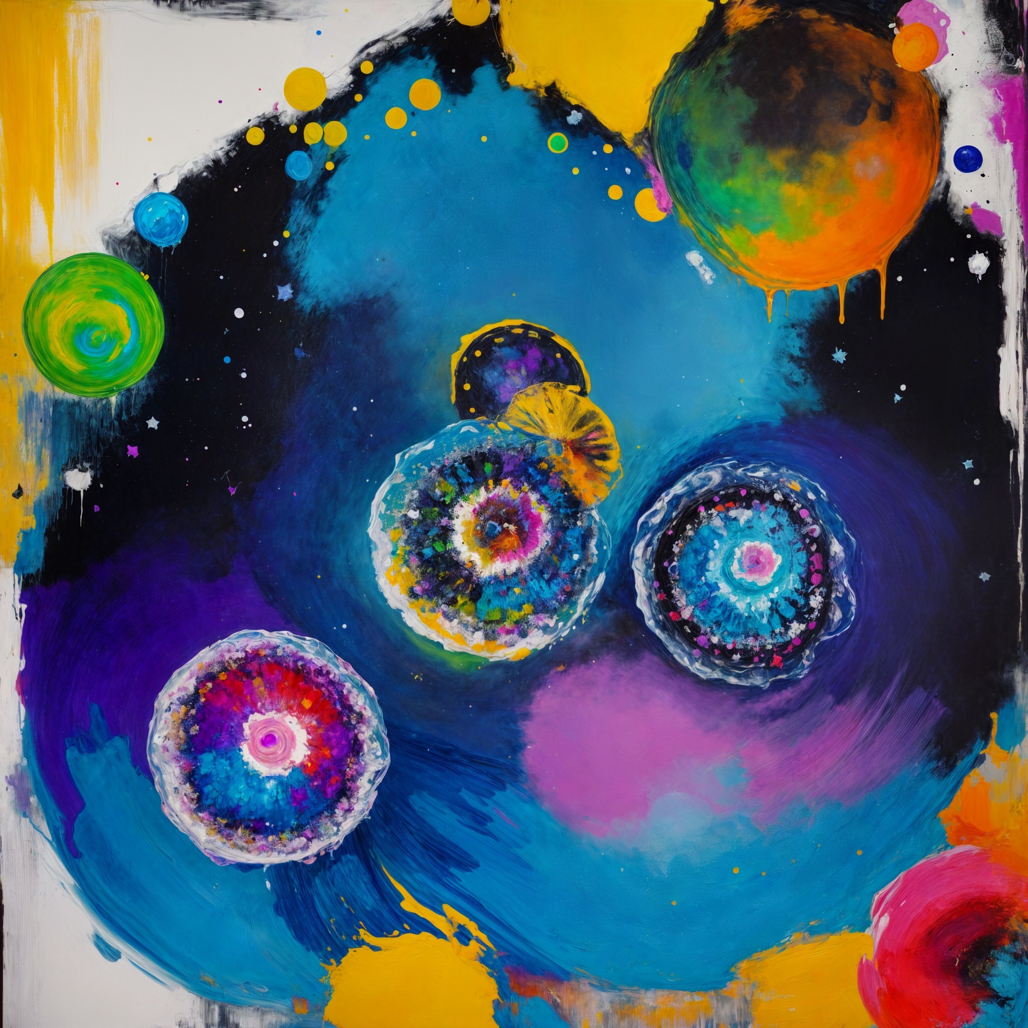 A vibrant, abstract painting featuring a large cupcake topped with swirling blue frosting and fresh berries, set against a vivid backdrop of colorful circles and splashes.