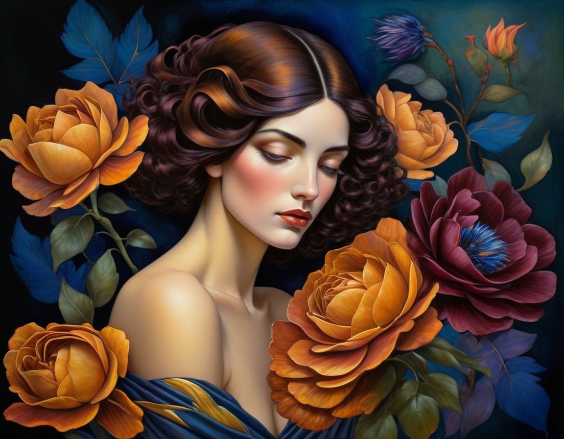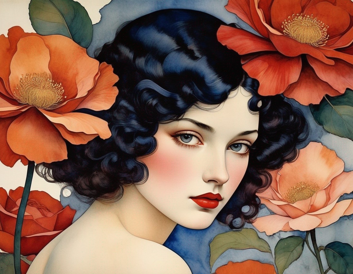 Beautiful woman in the style of WALTER MARTIN BAUMHOFER and rené gruauwhimsical, beautiful, poignant, touching. colors rose, gold, rust, indigo, burgundy, black. soft watercolor extra water in Art Deco by Annigoni, Egon Schiele, Milo Manara, Botticelli, Catrin Welz-Stein, Jean Metzinger, Klimt, perfect eyes, perfect hands face , highly detailed, complementary colors, hyper detailed. Watercolor and ink splatter, dynamic pose,