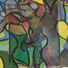The image features a stylized figure playing a violin, characterized by bold colors and geometric shapes. The figure stands elegantly, blending elements of abstraction and vibrant artistry.