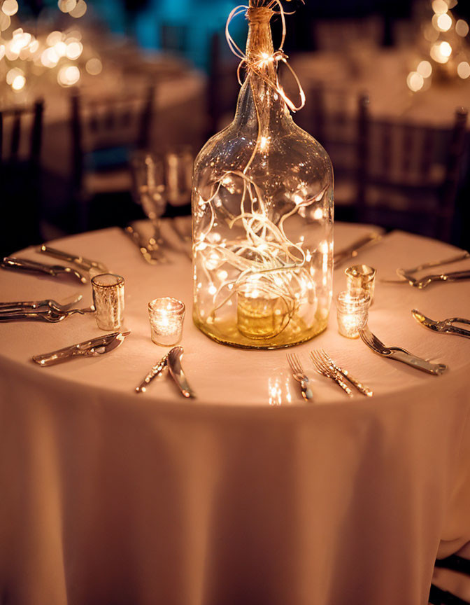 Prompt: "A gala event tablebtop decoration made with a blue glass bottle, golden fairy lights inside the bottle, a silver ribbon wrapped around the neck of the bottle, some golden and silver wands are inserted in to the bottle."