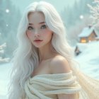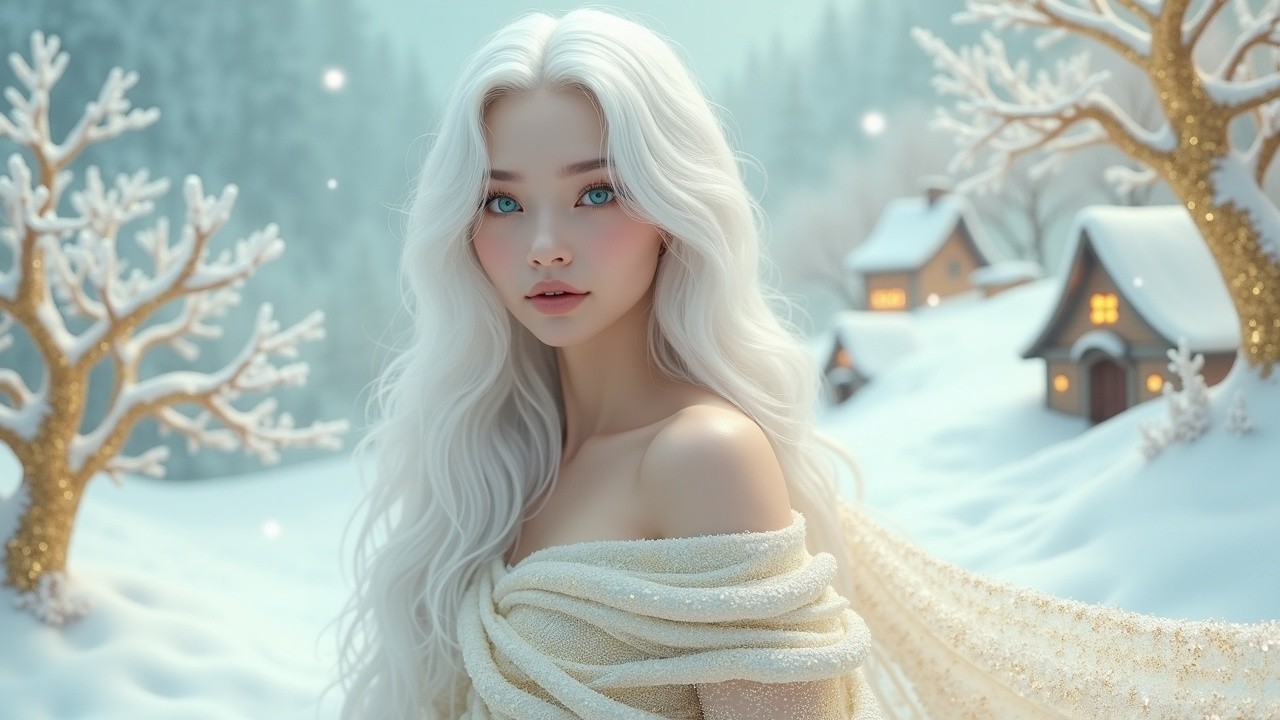 Prompt: "A highly detailed, digitally rendered portrait captures a striking young woman with porcelain skin and piercing blue-green eyes, her gaze directed slightly to the viewer's left with a soft, alluring expression. Her abundant, voluminous white hair cascades in long, flowing waves down her back and over her bare shoulders, intricately detailed and catching the light. She is adorned in a stylized, flowing garment or shroud composed of countless tiny, glittering white and gold particles, resembling freshly fallen snow or shimmering frost, which drapes over her body and partially obscures the background. The environment is a fantastical, snow-covered winter landscape featuring stylized, golden-branched trees with densely packed, snowy foliage, and charming, small, golden houses with illuminated windows, all rendered with a textured, almost crystalline appearance. The overall aesthetic is one of ethereal fantasy, with a soft, diffused light casting a gentle glow on the scene, highlighting the intricate details of the snow and gold textures. The composition is a medium shot, focusing on the woman's upper body and the immediate wintery surroundings, with a shallow depth of field that blurs the distant elements. The color palette is dominated by whites, pale blues, and metallic golds, creating a rich, luxurious, and magical atmosphere. Keywords: fantasy art, winter wonderland, ethereal beauty, intricate detail, digital painting, golden accents, snow-covered, flowing hair, enchanting.