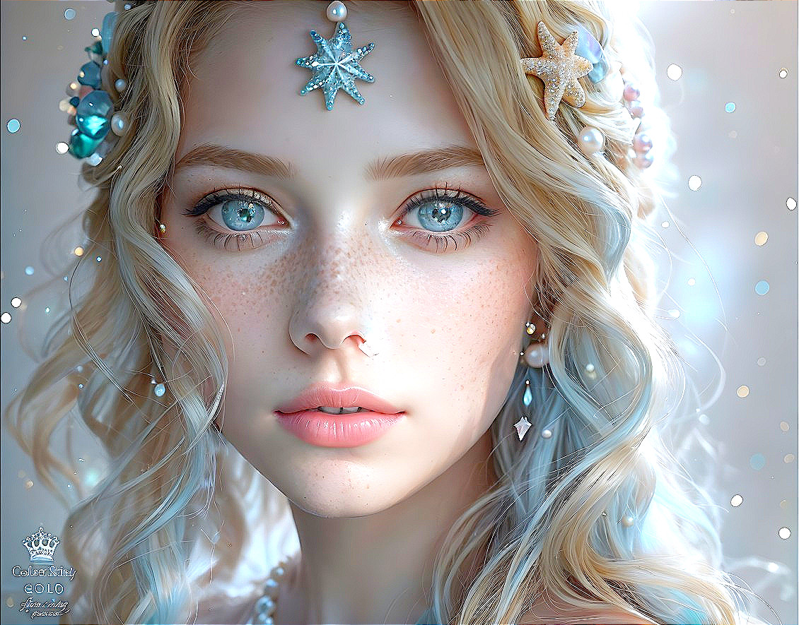 A digital portrait of a woman with blue eyes and blonde hair adorned with sea-themed jewelry, set against a soft, snowy background.