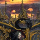 A mystical scene featuring a fierce, elegant figure with pale skin and ornate headgear, surrounded by serpentine dragons against a fiery sunset and jagged mountains. Dark fantasy vibes abound.