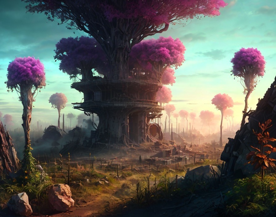Majestic pink foliage tree and ancient building in forest at sunrise
