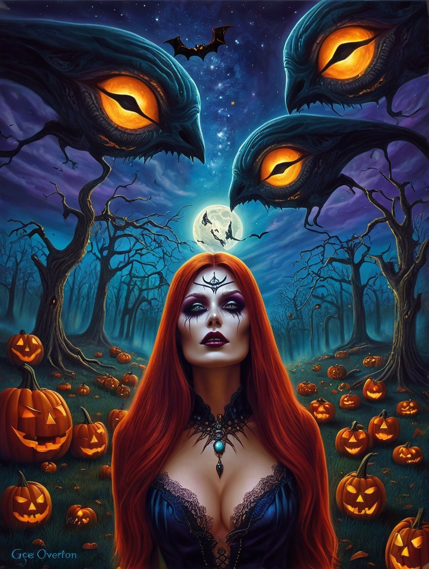 Mystical Woman in Dark Attire with Jack-o'-Lanterns