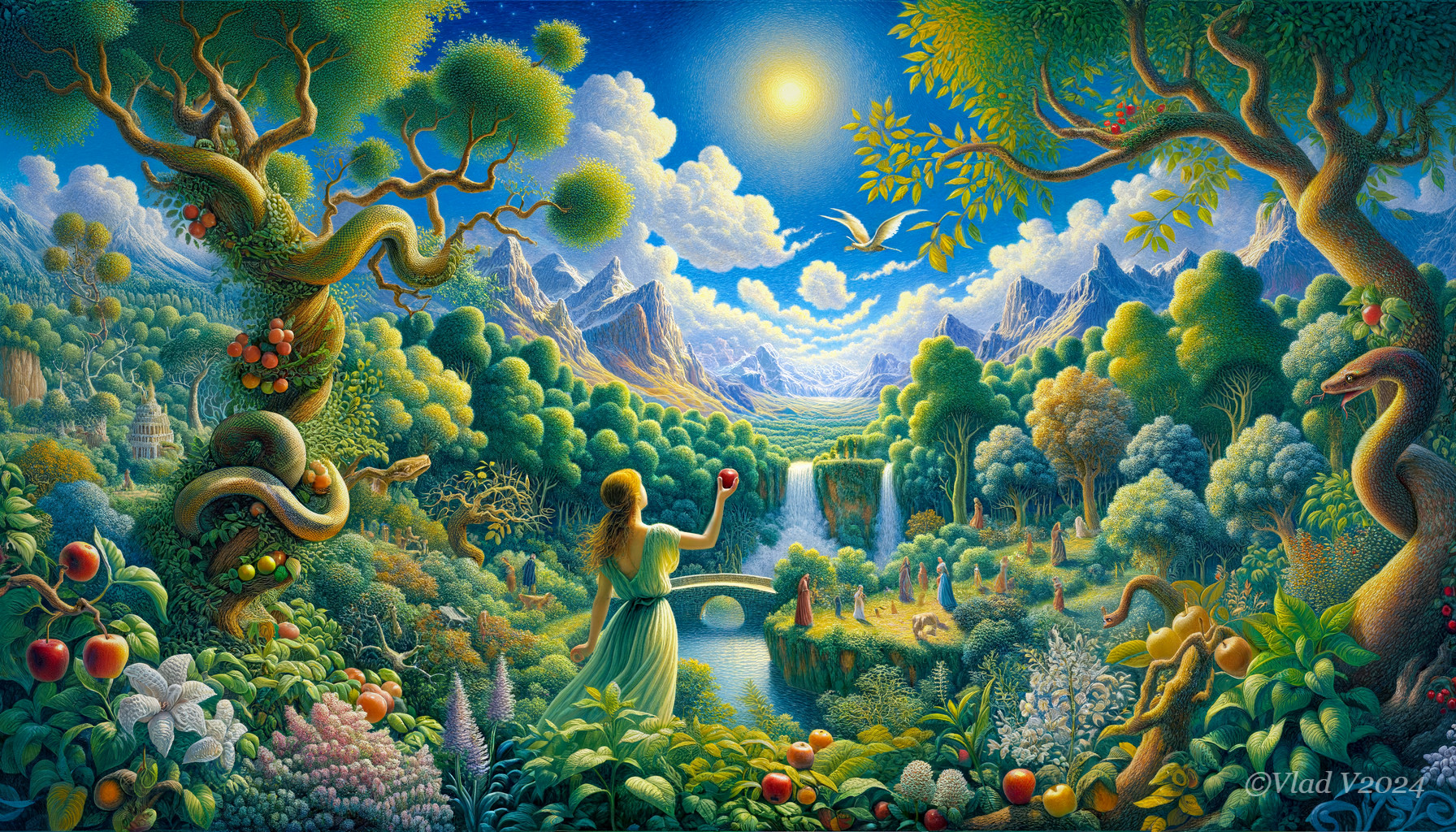 A vibrant, fantastical painting featuring a woman in a green dress amidst a lush, whimsical forest with serpentine trees and mountains in the backdrop.