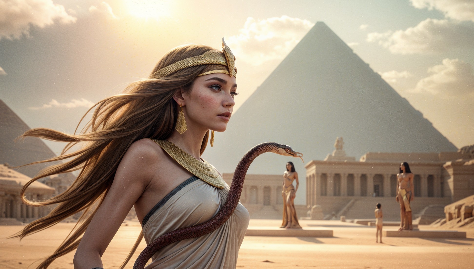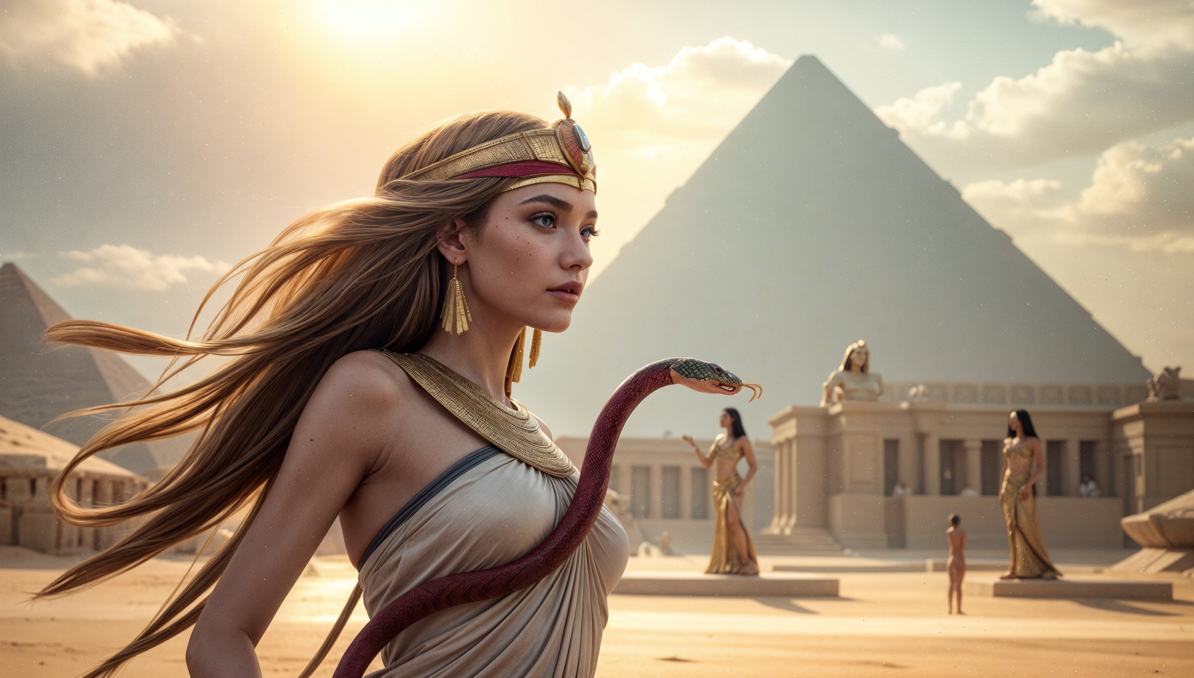 Prompt: Reference to hand hold snake shape - Egyptian queen. Background of an Artgem of dances in Pursuit of existence and happiness.