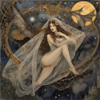 A beautiful figure in a black dress with lace, suspended in a dark sky filled with stars. She features bat-like wings, a web backdrop, and a mystical aura under the glowing moon and bats.