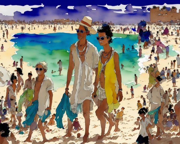 A charming street scene features elegant, pastel-colored row houses adorned with greenery. Bright doorways and sprawling trees create a warm, inviting atmosphere. Sunlight adds a vibrant touch.