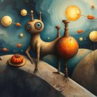 A whimsical, cat like creature with large blue eyes stands on a surreal landscape, surrounded by floating orbs and a large pumpkin, evoking a sense of curiosity and wonder in a dreamlike setting.