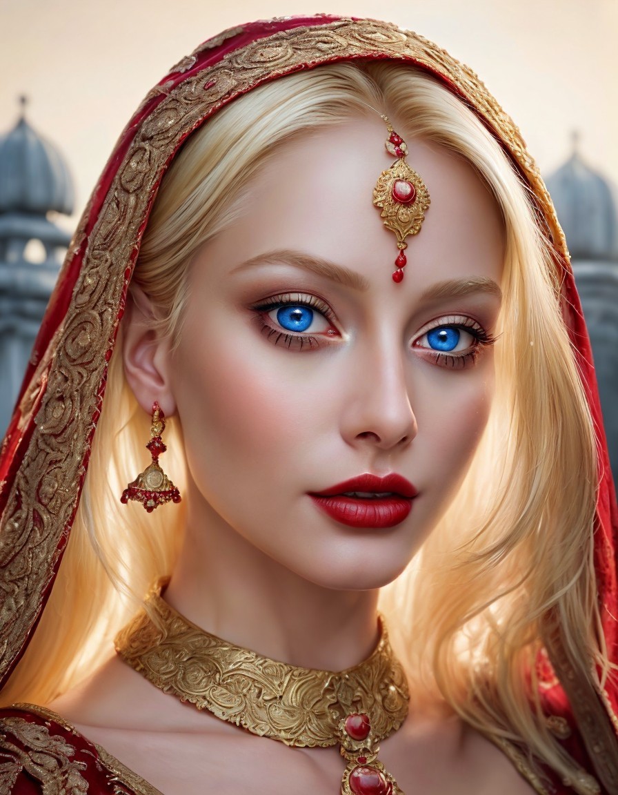 Prompt: "A gorgeous blonde woman, age: 35 wearing Indian wedding red Lahenga and gold ornaments, very deep cleavage, red glossy lipstick, blue eyes. Mistic background."