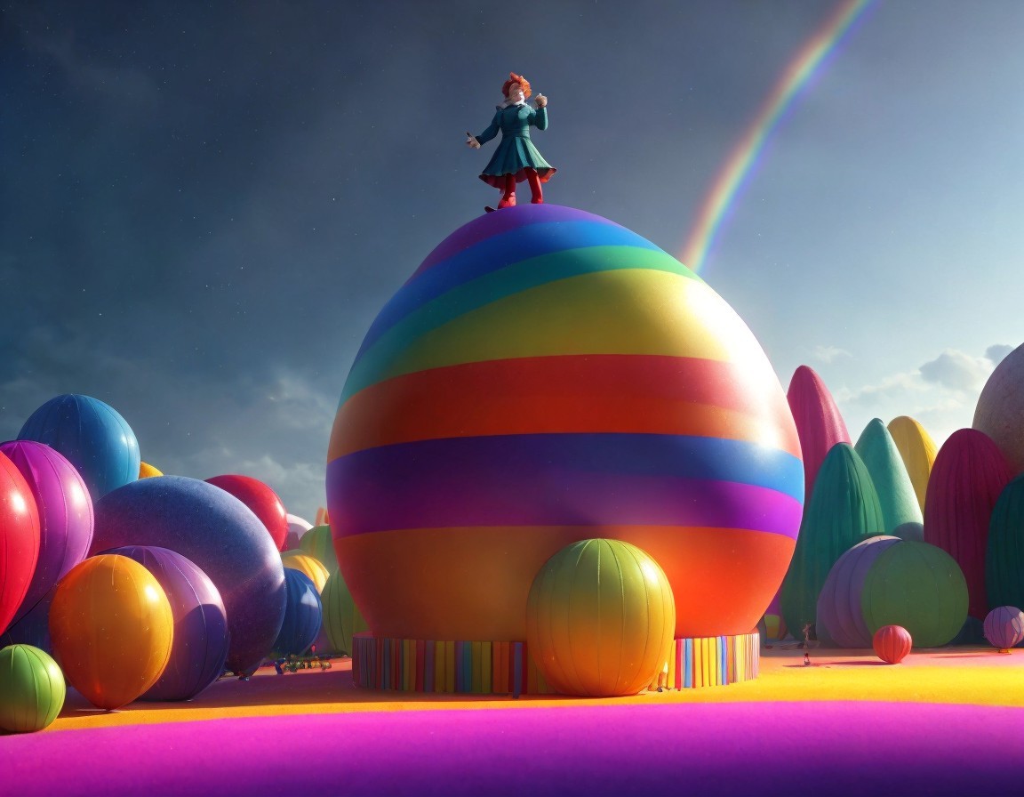 Clown Balancing on Striped Balloon with Rainbow Sky