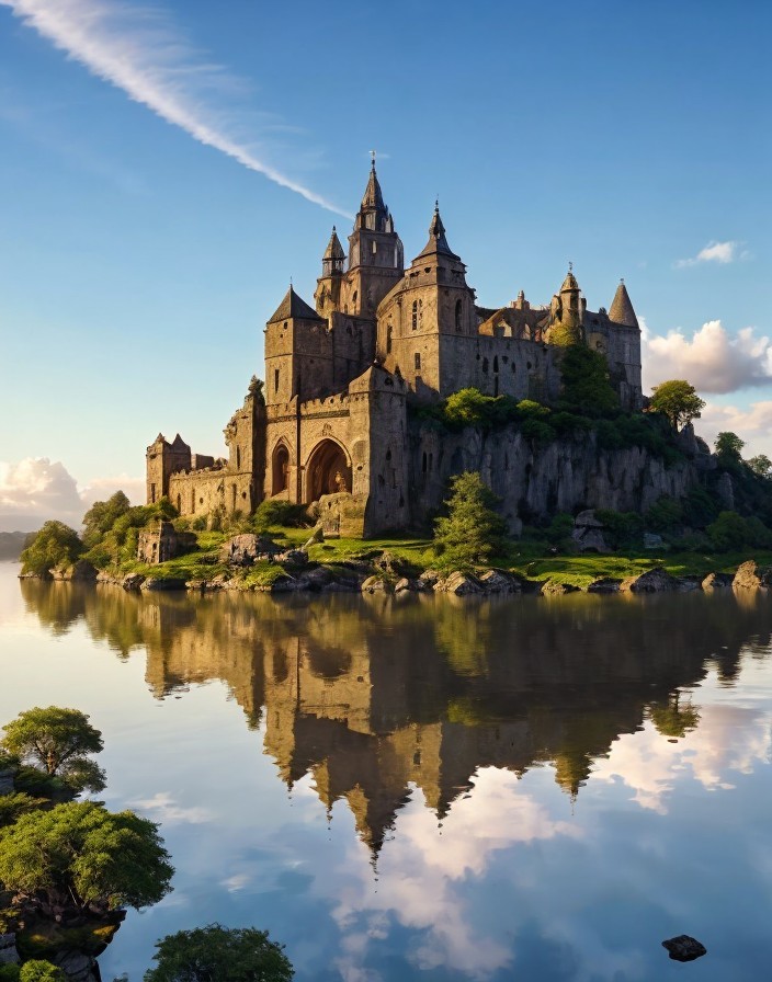 Prompt: "A captivating scene of a mystical floating island at sky: A large, rocky island floats amidst the clouds, with its upper surface featuring ancient stone buildings with white domed roofs, surrounded by lush greenery. The structures have a medieval aesthetic, with arches and domes crafted from brownish stone, providing a stark contrast to the white roofs. A prominent tree with vibrant green leaves stands at the center of the island, accompanied by smaller plants near the buildings. The island is set against a clear blue sky, with fluffy white clouds enveloping its base, suggesting either dawn or dusk. This serene and fantastical image combines elements of fantasy, nature, and antiquity, creating a sense of wonder and otherworldliness. , soft focus, depth of field, 8k photo, HDR, professional lighting, taken with Canon EOS R5, 75mm lens"