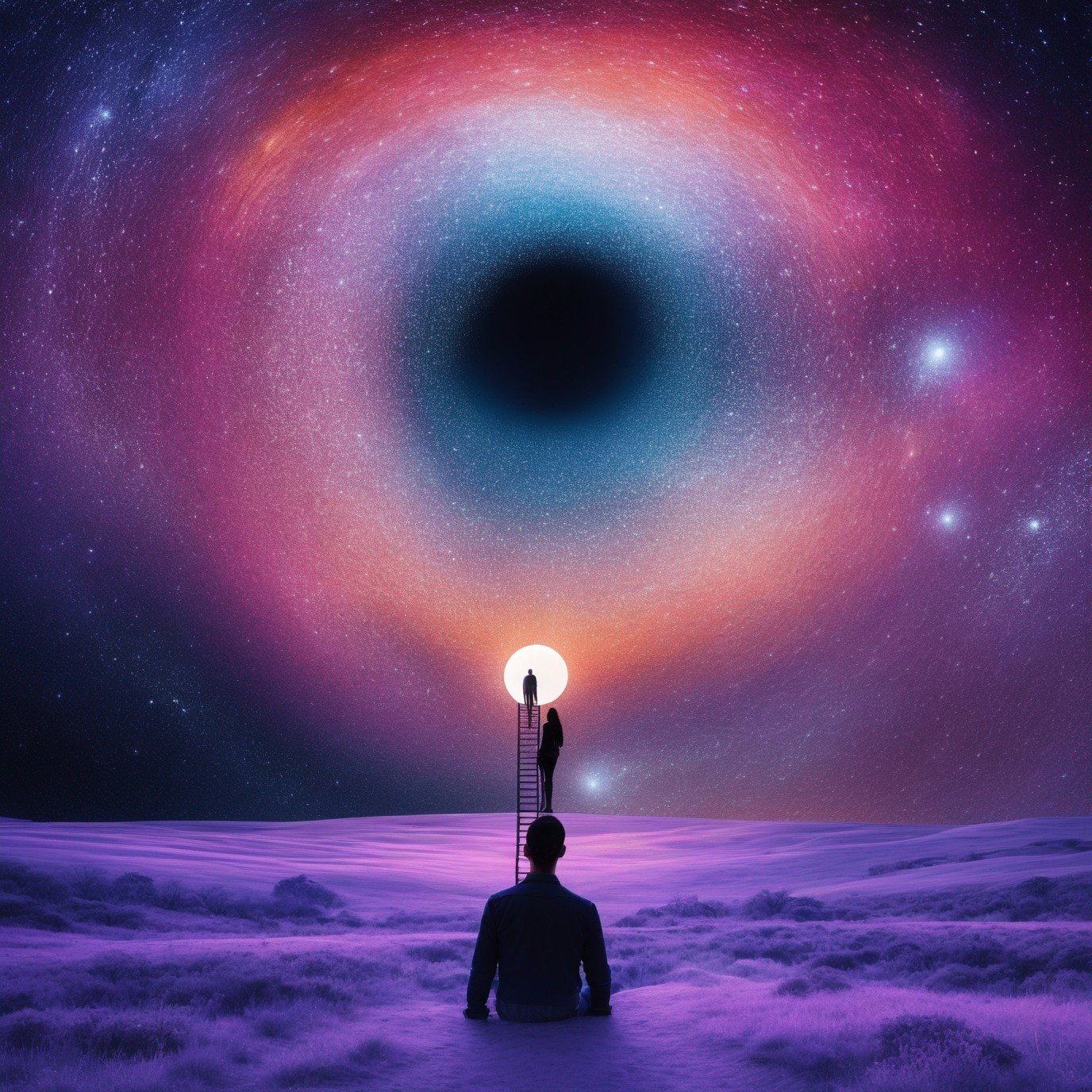 Surreal landscape with person facing giant black hole