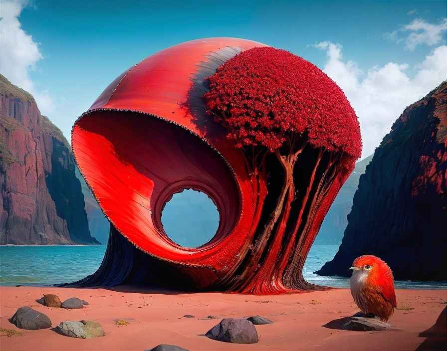 A surreal landscape featuring a giant, red, shell-like structure with a vibrant red tree atop it, set against a sandy beach and blue ocean, accompanied by a striking red bird nearby.