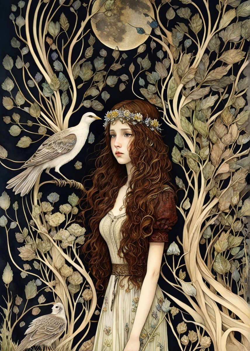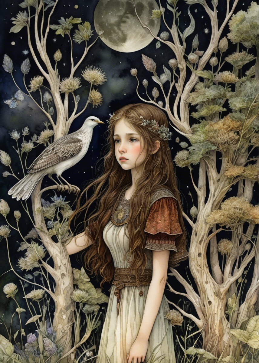 A young girl stands in a field under a full moon, surrounded by tall grasses and wildflowers. Her long hair flows against a backdrop of dark, dramatic clouds, conveying a sense of mystery.