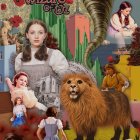 A vibrant, artistic collage inspired by "The Wizard of Oz," featuring Dorothy, iconic characters, the yellow brick road, and magical landscapes, all infused with whimsical colors and details.