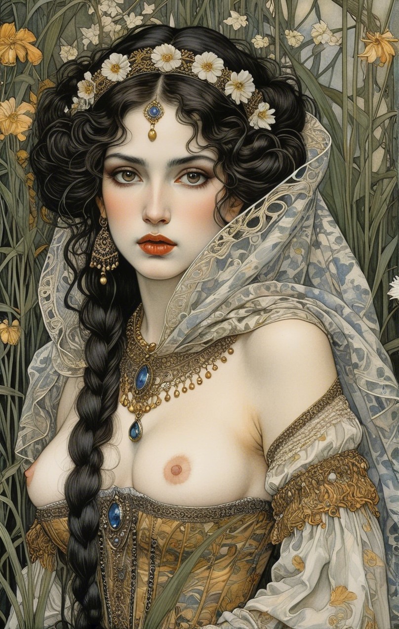 A young woman with long, braided hair adorned with flowers wears an intricate golden dress. She has delicate features, holds a serene expression, and is surrounded by lush greenery and blooms.