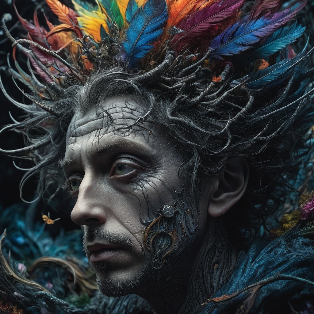 Serious man with blue facial paint and colorful feather headdress