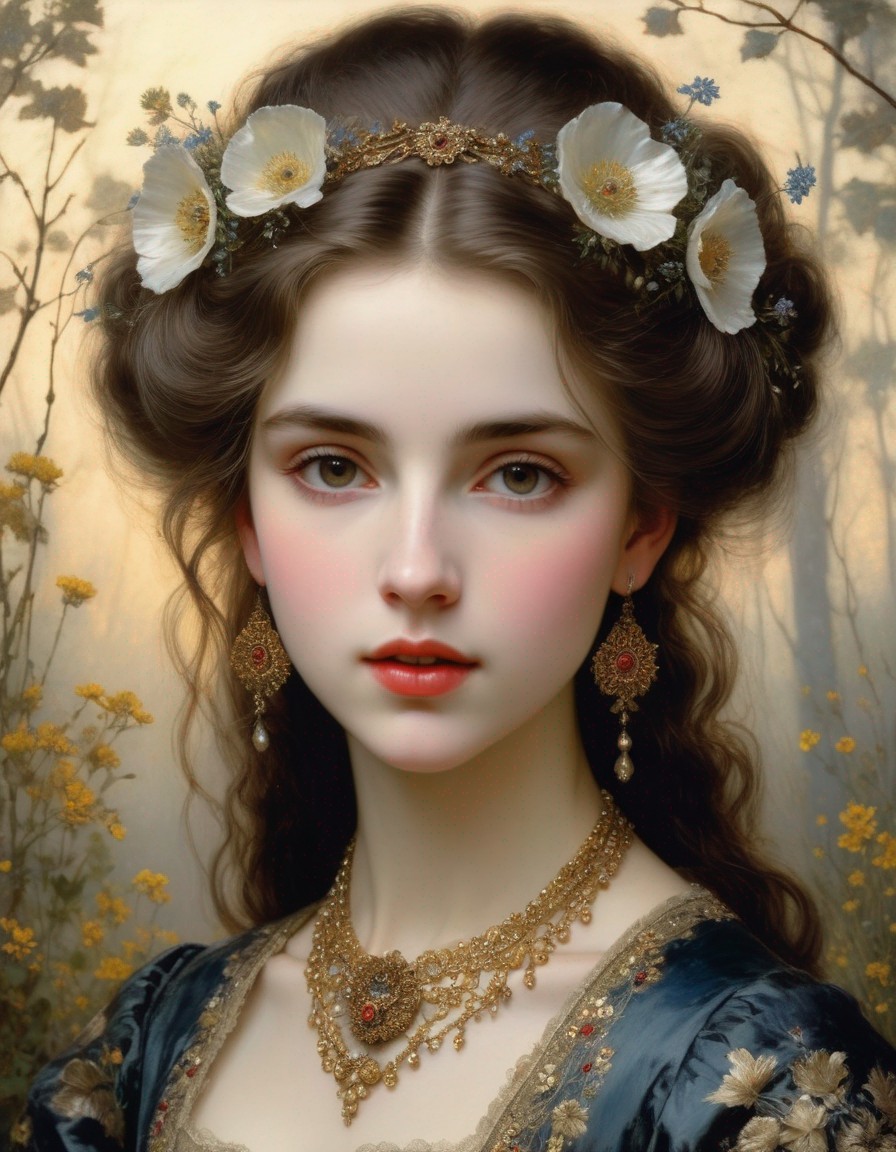 An elegant woman in vintage attire with a floral hat stands amidst a moonlit, dreamy forest setting.