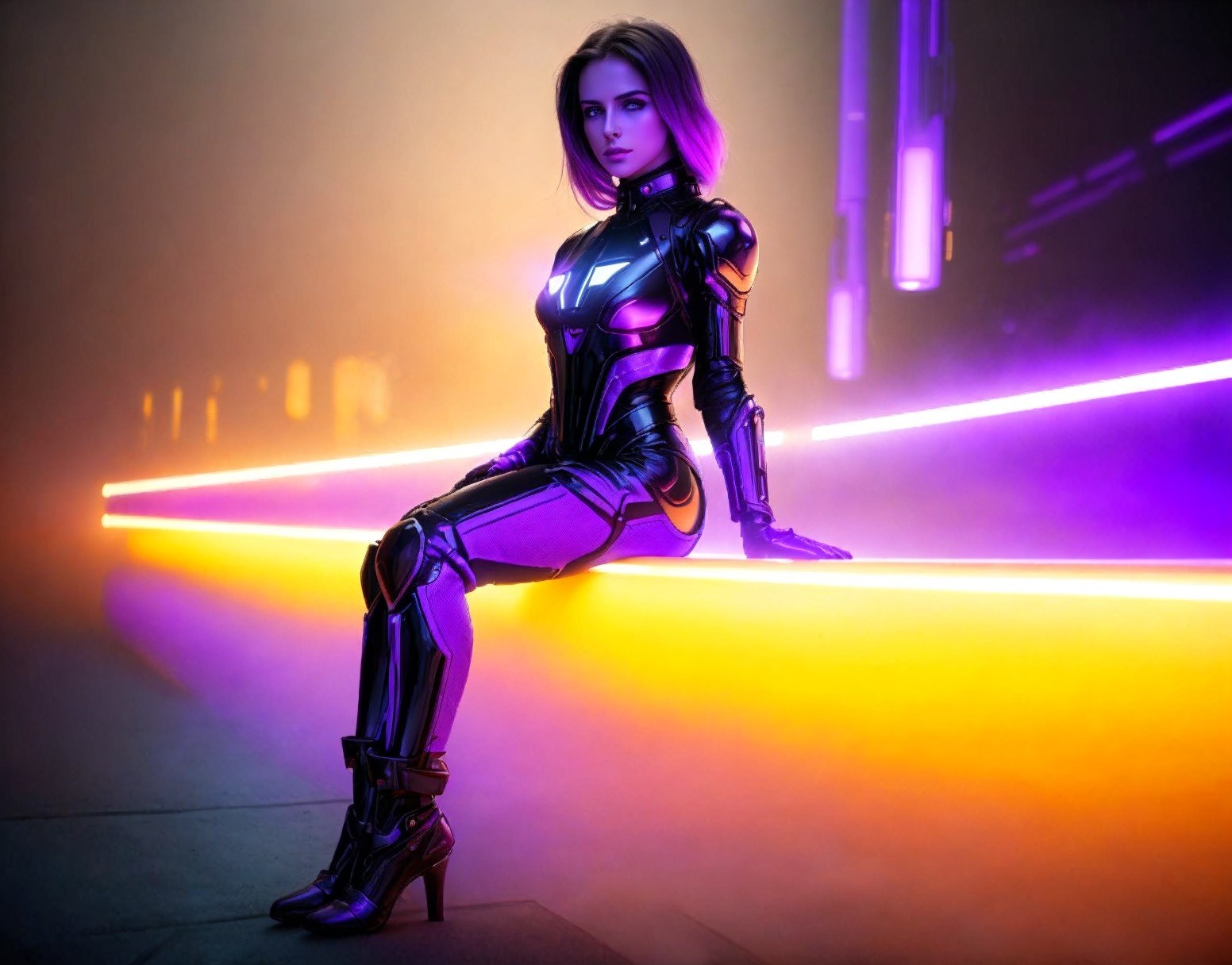 A woman in a futuristic black armor suit sits in a neon-lit setting with purple and yellow lights casting a glow around her.