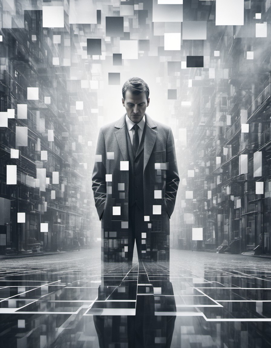 A man in a suit stands in a futuristic city with floating square elements around him, evoking a sci-fi atmosphere.