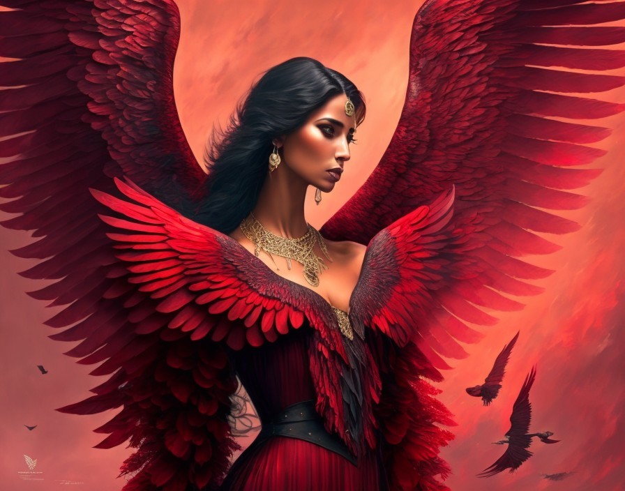 A woman with red, angelic wings stands majestically against a red sky, wearing dark, elegant clothing and silver jewelry.