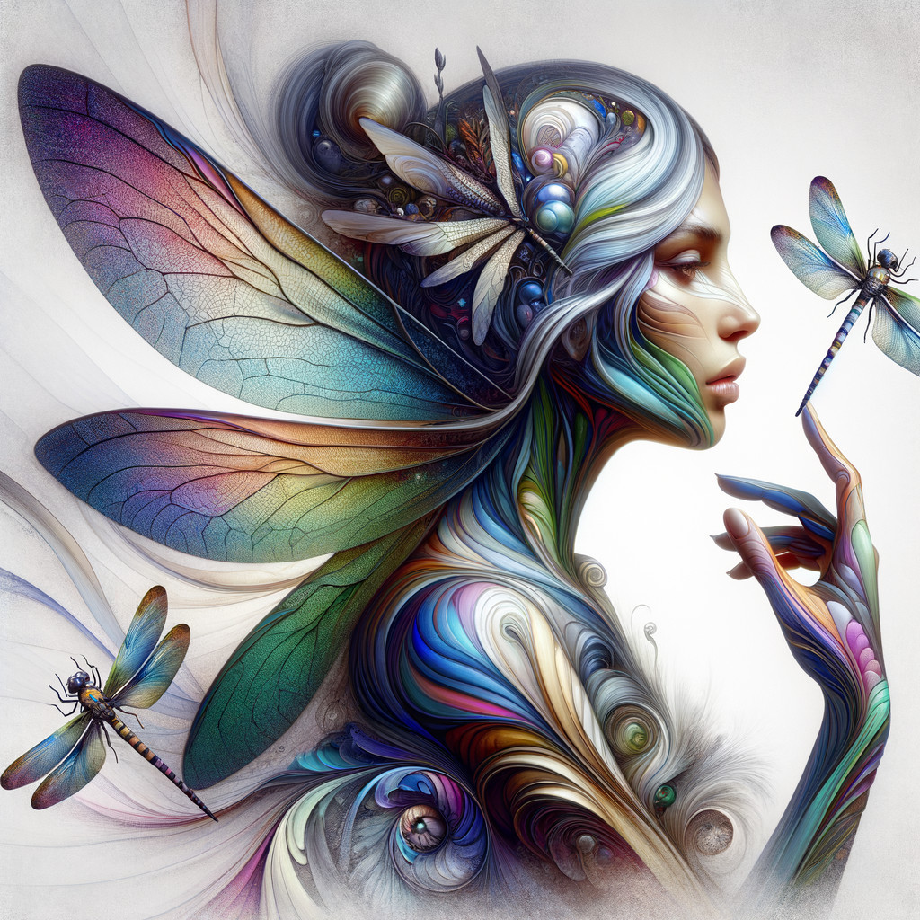 A vibrant, ethereal fairy with colorful wings interacts gently with dragonflies, showcasing intricate swirls of color and intricate details in a magical, dreamlike atmosphere.