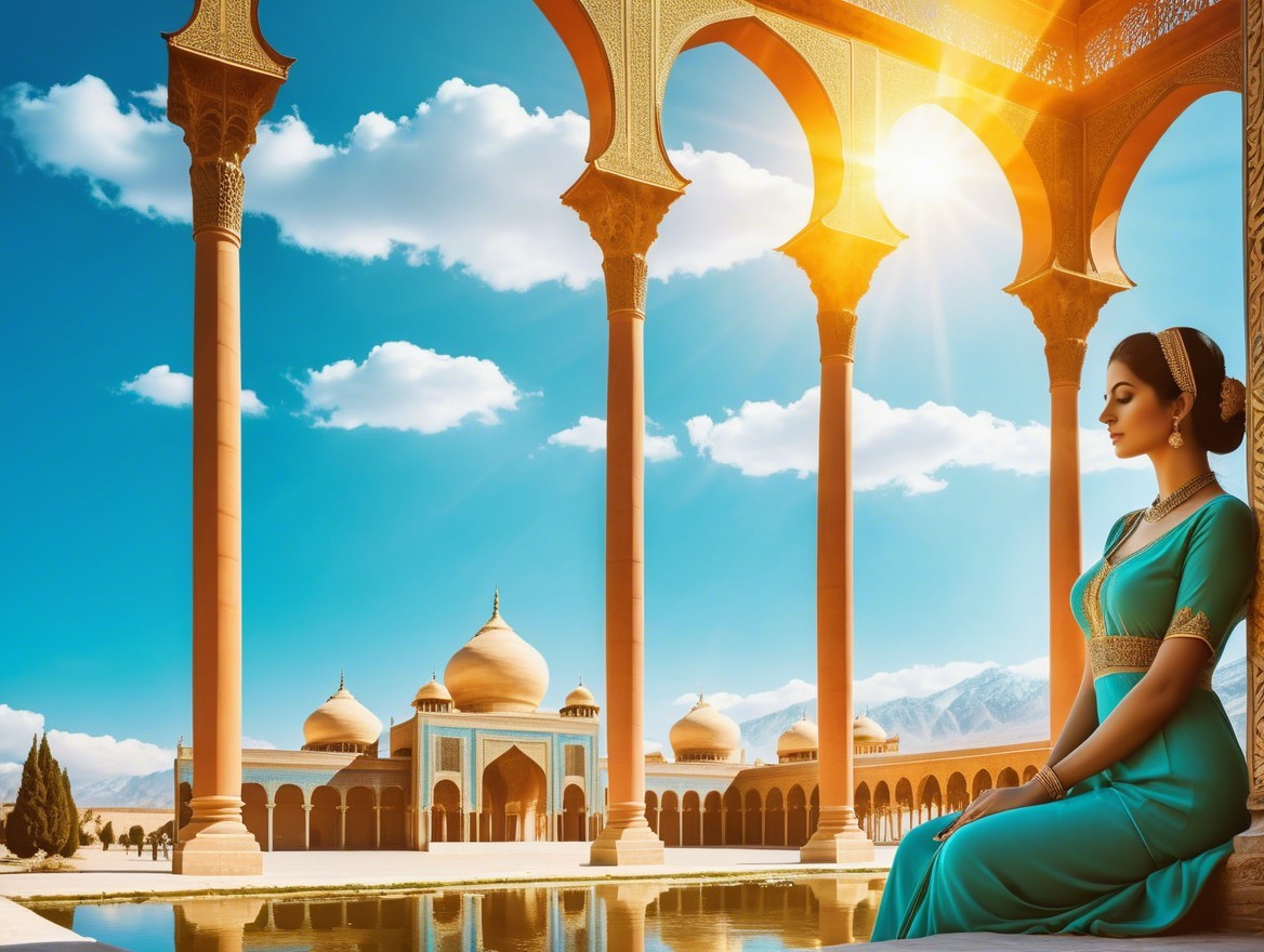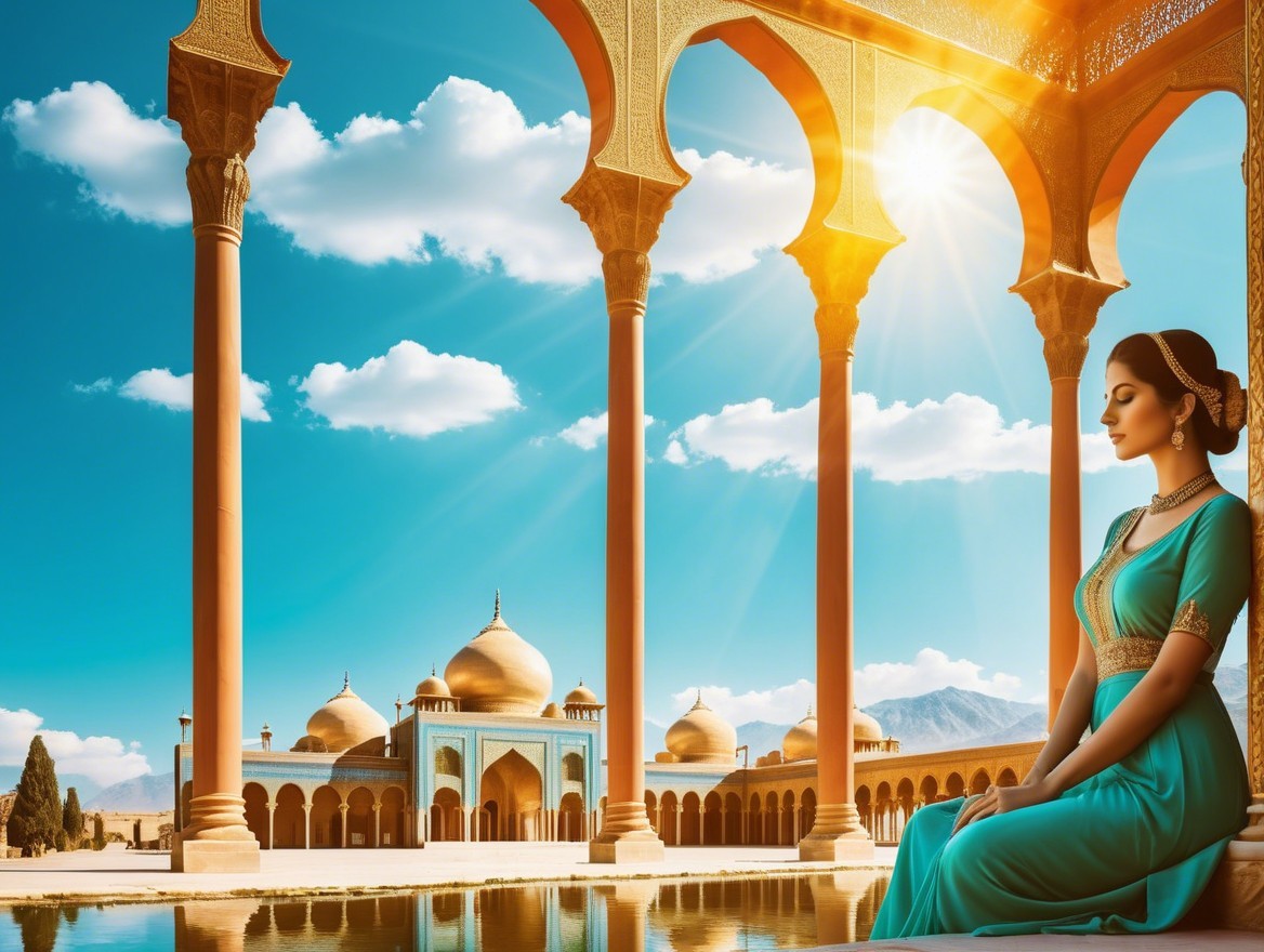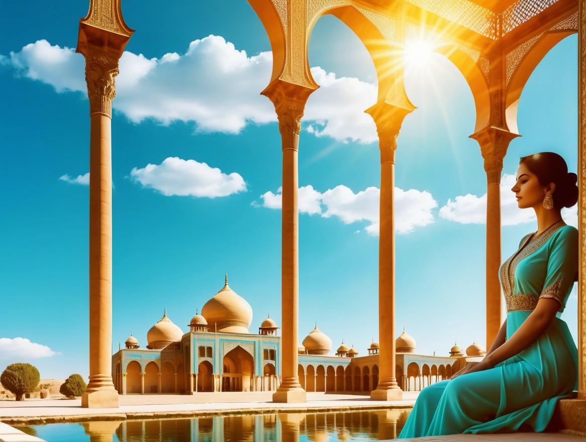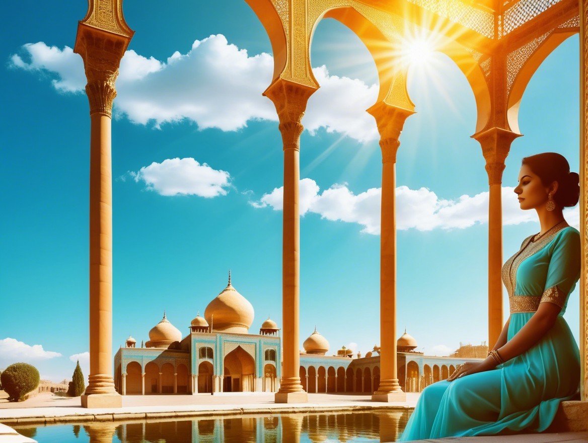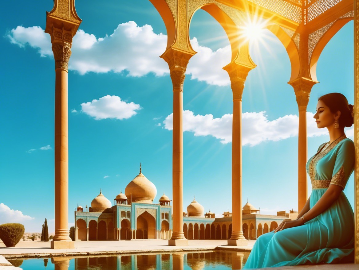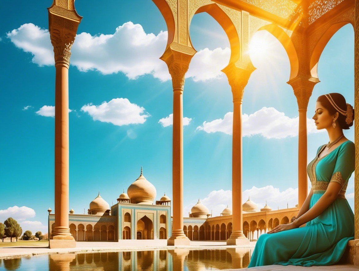 A serene woman in a blue dress sits beside a reflective pool, framed by elegant arches. Majestic domes loom in the background under a bright sky, bathed in warm sunlight.
