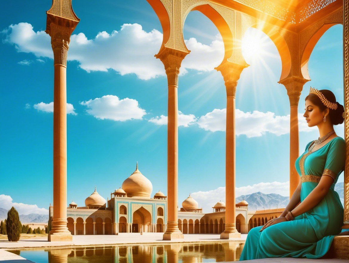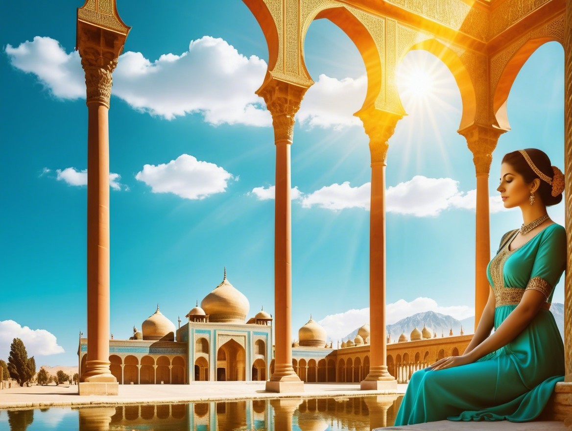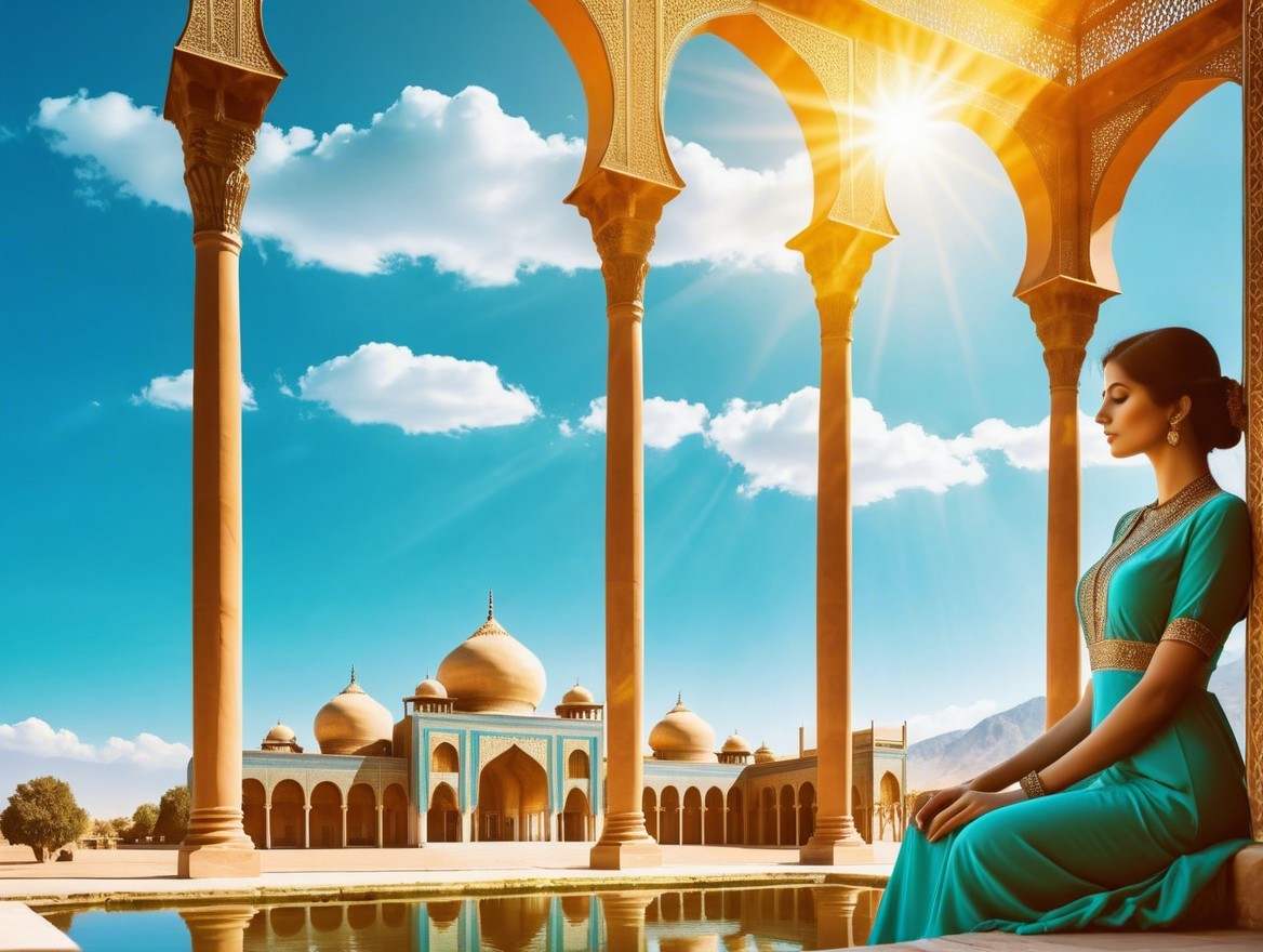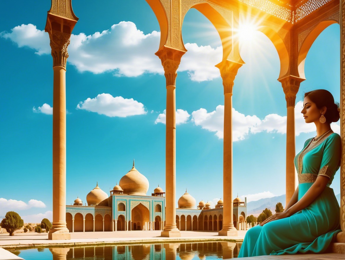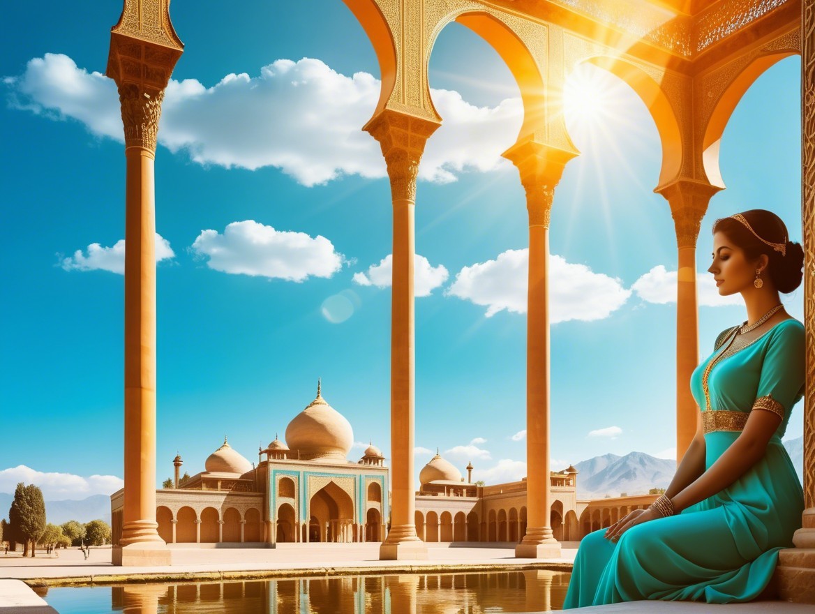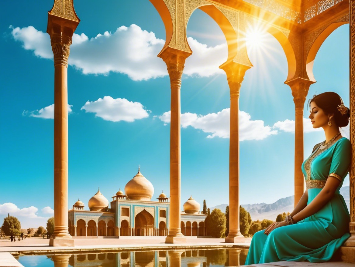 A serene woman in a blue dress sits beside a reflective pool, framed by elegant arches. Majestic domes loom in the background under a bright sky, bathed in warm sunlight.