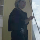 A woman stands gracefully by a window, wearing a stylish dark coat with a fur collar. Her thoughtful expression is complemented by soft natural light streaming in from outside.