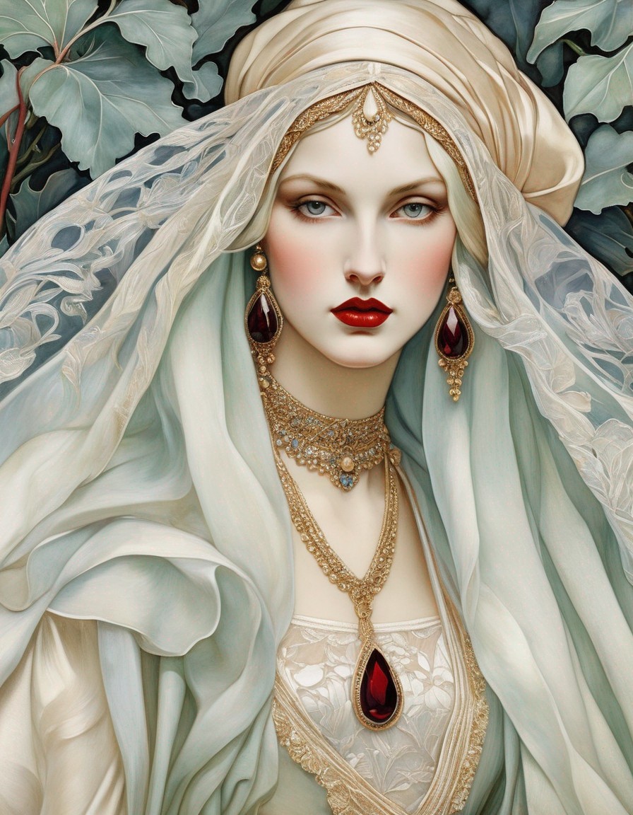 art nouveau style, portrait of a woman, by Tamara de Lempicka & Walter Crane, intricate details, crisp quality,coloured