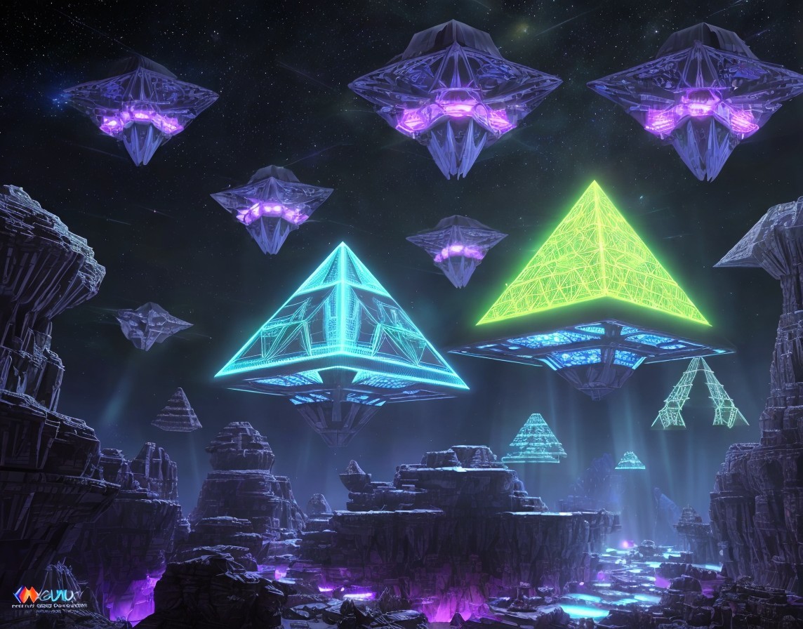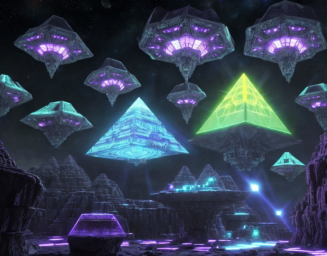 Volumetric lighting, 3D geometric vector fractal, High-tech Underground/cavernous DMT laboratory on alien planet, Extraterrestrial pyramid - cosmic menagerie assimilated with sacred geometric patterns and advanced alien technology. Geometric pattern of hexagonal honeycomb glowing with scifi lasers. flying saucers, pyramid with bioluminescent mushrooms and colossal mineral crystals. Alien plants, Realistic and natural elements, under a cosmic sky surrounded by symbols like sacred geometry, mystical talismans and mysterious runes. galactic DMT art, hallucinogenic visionary vibes, shamanic LSD art, and the ethereal DMT realm. In the style of Cameron Gray