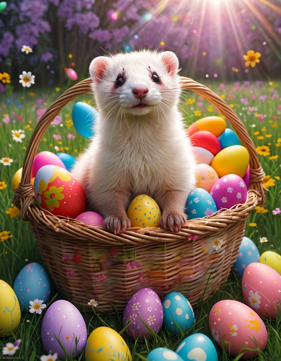 Prompt:  Fluffy ferret frolicking in meadow, basket of colorful Easter eggs, blooming flowers backdrop, playful moment, lens flare effects, vibrant colors, hyperrealistic details, 8k resolution. Blend Junji Ito's horror, Robert Oxley's mastery, Gazelli's uncanny touch, M.W. Kaluta's surrealism. Mixed brush strokes, paint splatter, drip painting, masterpiece, ArtStation trend. Nikon Z9, 85mm F1.2 lens, intricate details, high-resolution, photorealistic quality.