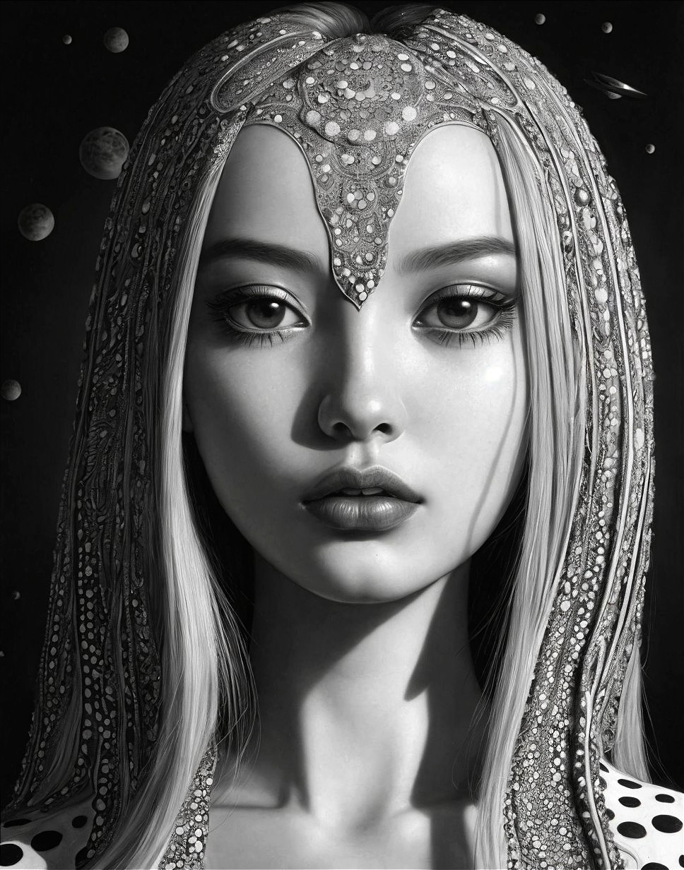 Prompt: 151515:[Surrealistic artwork of young woman captured from above, influenced by Yayoi Kusama and Dali. Dreamlike perspective with exaggerated features, floating in abstract space. Highly detailed, intricate lines and patterns. Monochromatic color scheme adds to the mysterious atmosphere]