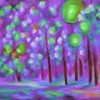 A vibrant, dreamlike landscape features colorful trees with rounded leaves against a rich purple sky. A quaint orange house is nestled among reflections on a serene water surface dotted with leaves.