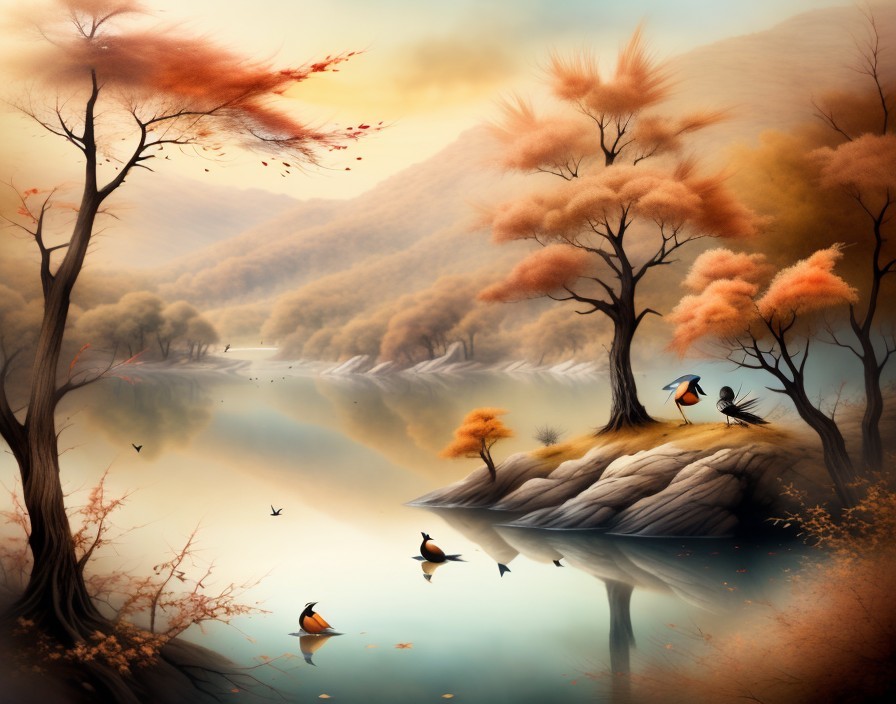 Tranquil Lake Surrounded by Autumn Trees and Mountains