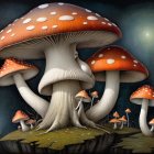A whimsical scene features oversized mushrooms with vibrant caps towering over a cozy cottage. The dark, rainy night sky is illuminated by a full moon, creating an enchanting atmosphere.