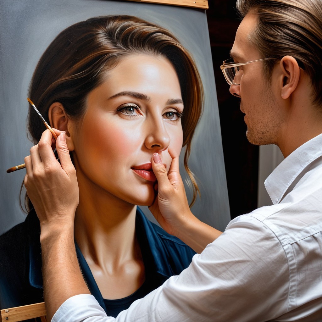 Prompt: "A woman is painting a naturalistic oil portrait of a man. From inside the portrait, the man is reaching out to touch her cheek, oil on canvas, highly detailed, realistic oil painting"