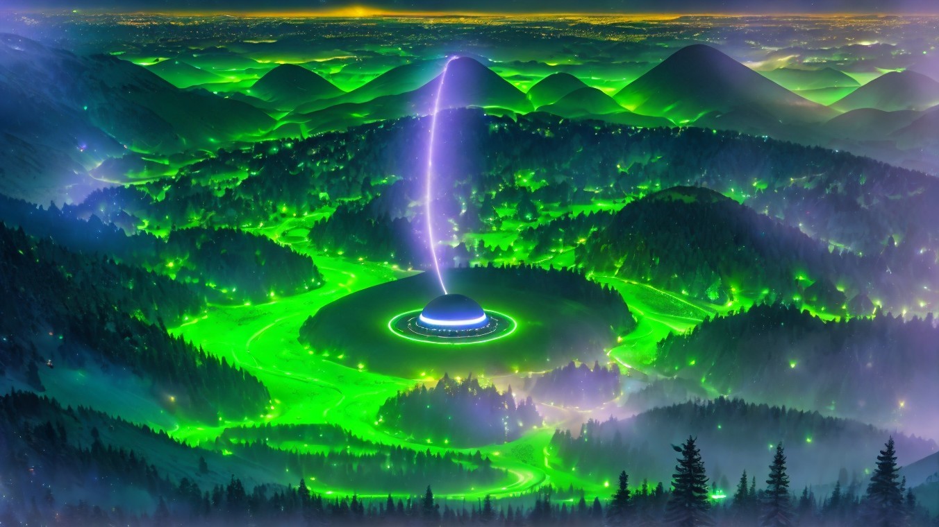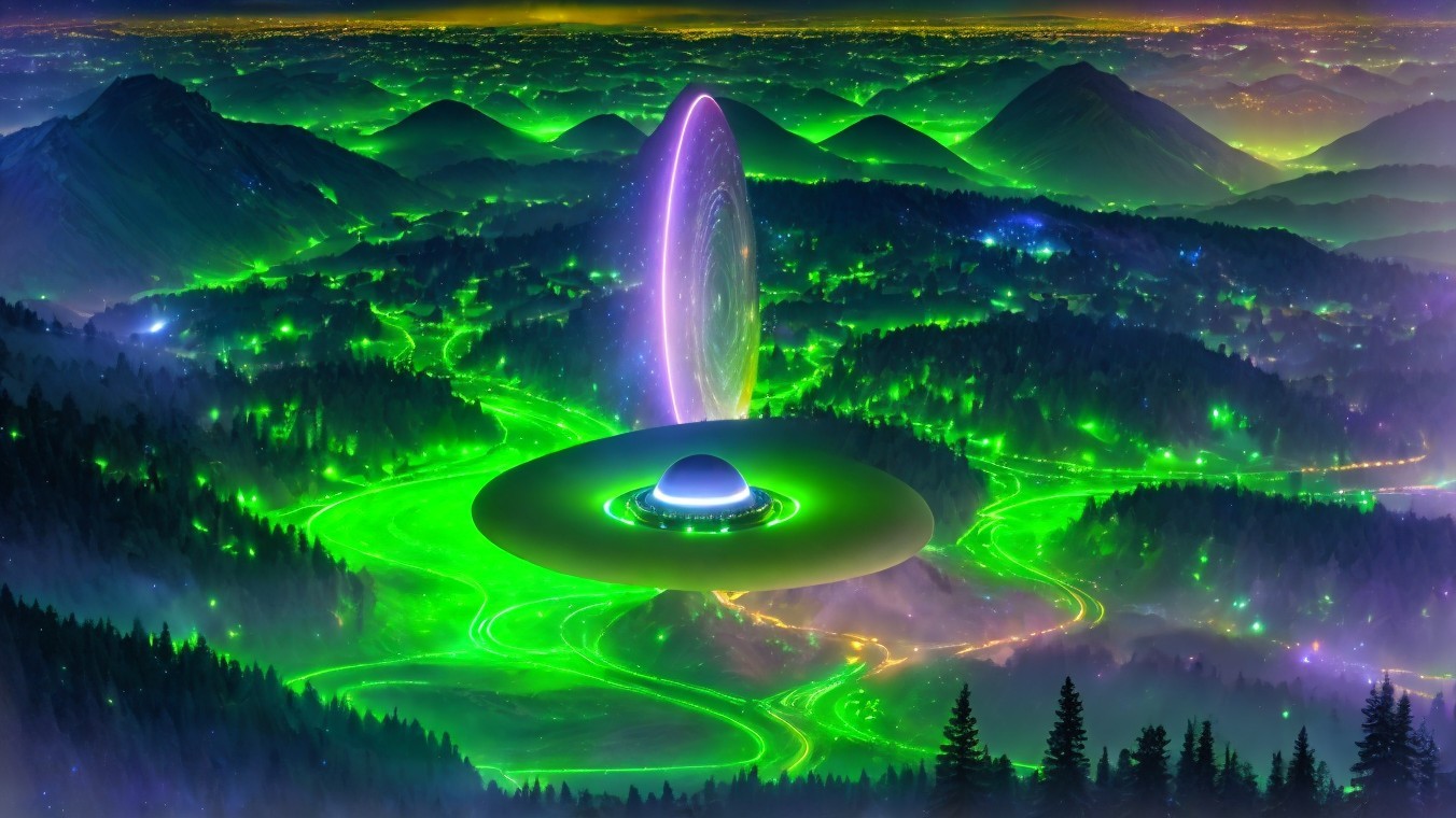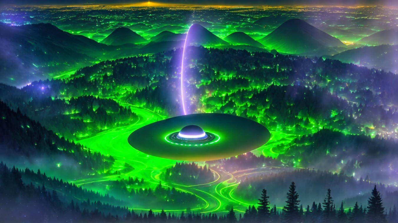 A vibrant digital artwork of a UFO emitting a beam of light over luminous green hills under a starry night sky with a crescent moon.