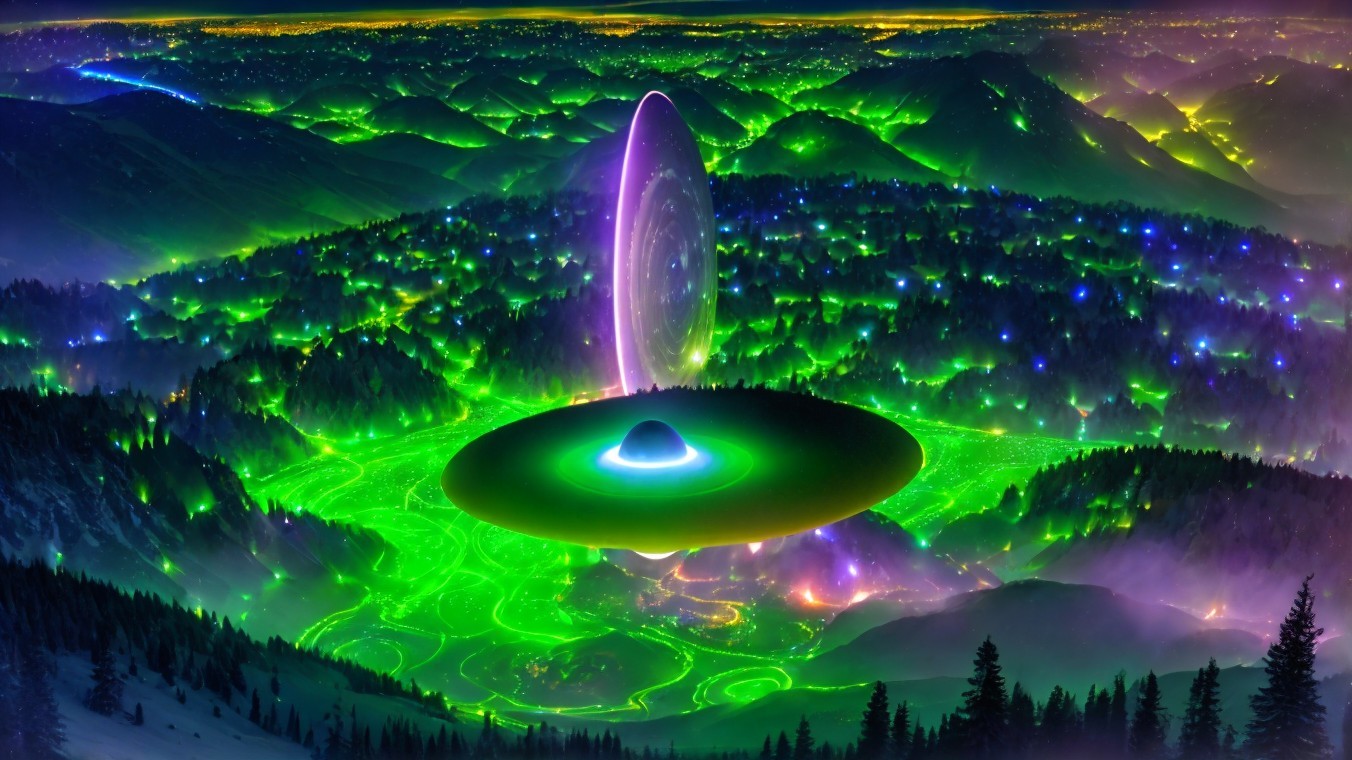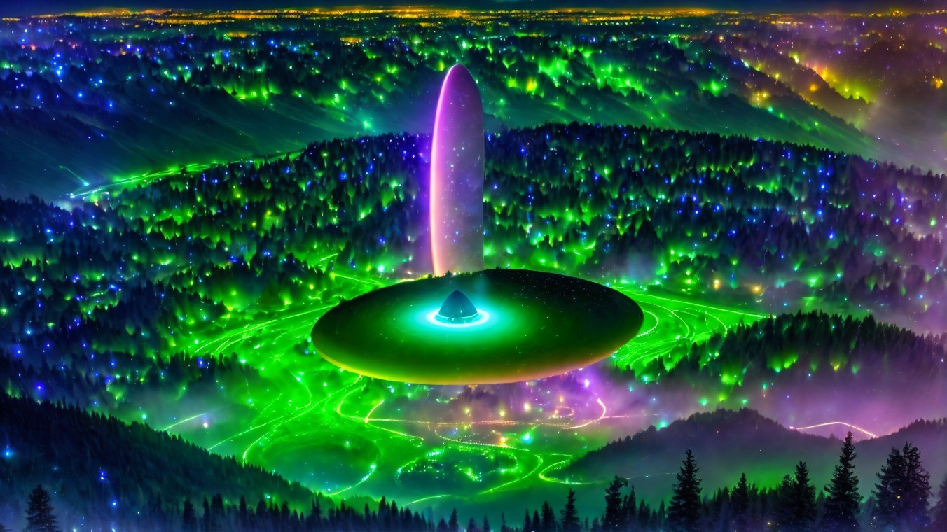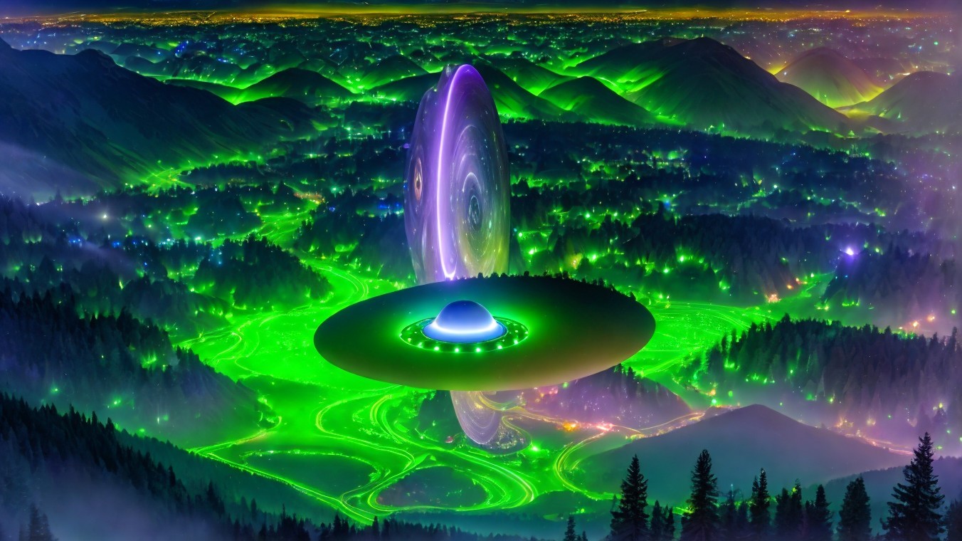 A vibrant digital artwork of a UFO emitting a beam of light over luminous green hills under a starry night sky with a crescent moon.