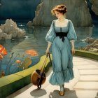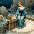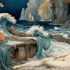 A serene, dreamy scene featuring a woman in elegant attire reclining against vibrant fabrics, with crashing waves and a full moon in the background, blending natural beauty and fantasy.