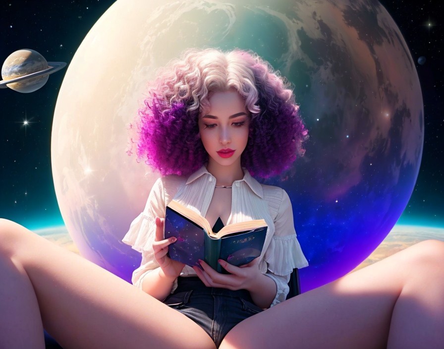 Young woman is reading a book sitting on a rocking chair in the middle of outer space.