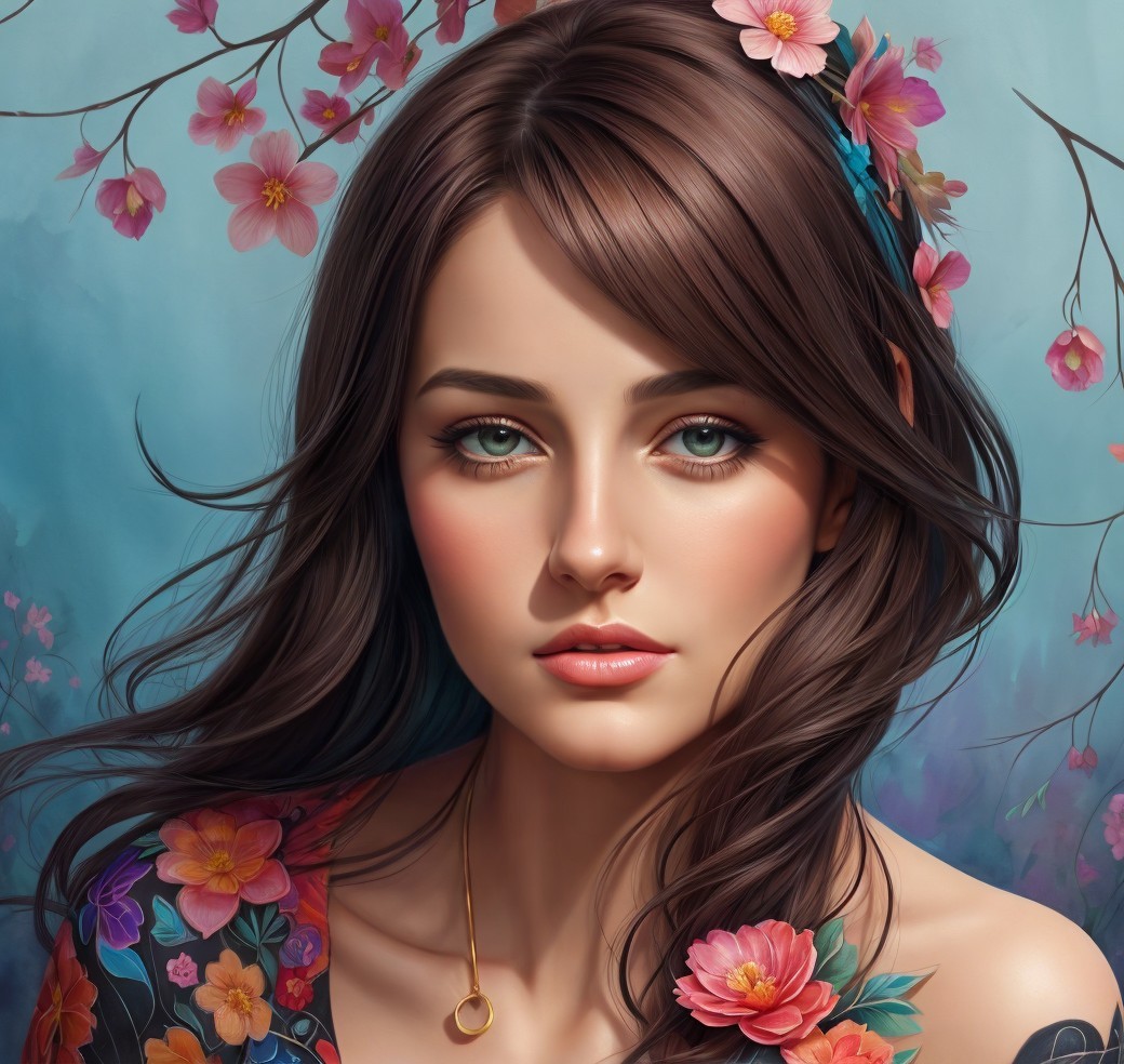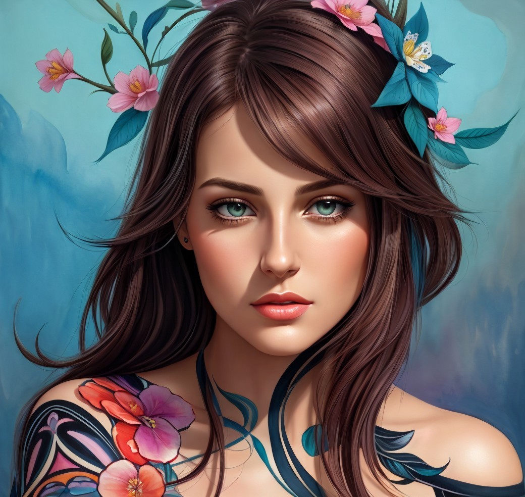 Beautuful Female face, illustrative stylization art, stylistic,l upper body portraiture, cel-shading, stacked-up view, intricate accuracy, dark dusky background, hues, chiroscuro lighting, anisotropic filtering 1.7, raytraced shadows 1.8, sublime, cottagegore 1.9, digital painting, synthetic, biomorphic details, atmospheric, coherent, tints of sketch art, tints of 1970s advertising art, volumetric plushy design, comical essence, Watercolor and ink portraiture, wavery texture on old paper, tints of 1970s advertising art, back-lit, complexion 1.4, radiance, brightness 1.4, style of Brian Duffy, Richard Burlet, Geoff Darrow, Margaret Keane, Susan Seddon Boulet, Georgia O'Keeffe, Marsden Hartley, Bob Eggleton, triadic color scheme turquoise beige brown, 3d effects 1.8, dynamic lighting 1.7, colorful iridescence, intricate details, octane render, luminous, mezzotinto, wavery pasture, highcoloring1.9.4, , plasticity 1.6, ambient occlusion 1.5, raytraced shadows 1.8, kinetic, cottagegore 1.2, octane render, high coloring 1.9, speed painting, tints of comic book art in style of Overton Loyd, beautiful artwork, stylized illustration 1.5, saturated colors 1.5, Pastel colors of green beige brown, american gothic 1.7, cottagegore 1.3, dynamic lighting 1.7, detailed ornamental features, glossy lighting,